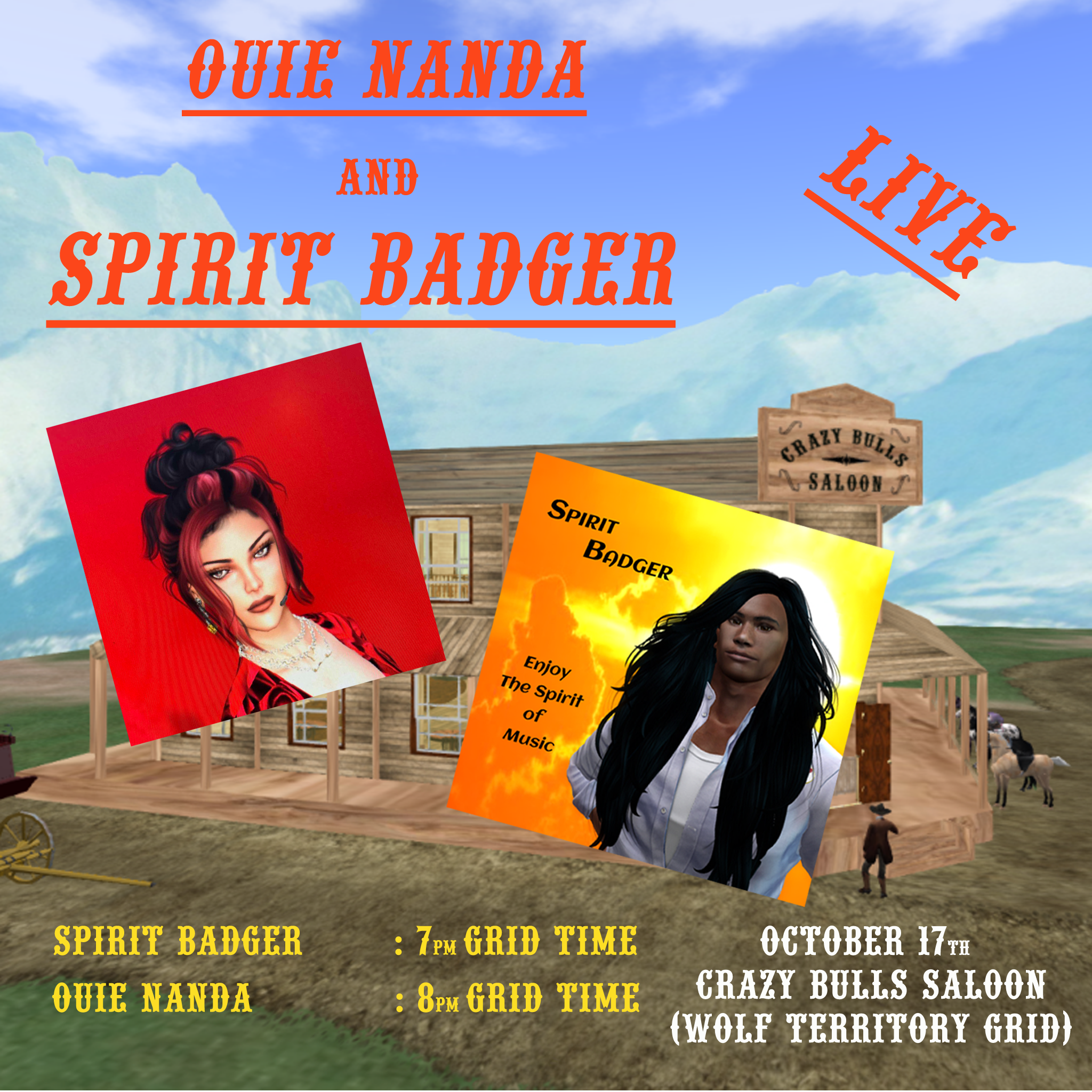 | Spirit Badger Live | Great Plains | Spirit Badger is singing Live at the Crazy Bulls Saloon starting at 7pm Grid Time. Join the fun and enjoy his live tunes. Come and enjoy the evening in good ole western saloon atmosphere. Everyone is Welcome. Take the coach to hop://grid.wolfterritories.org:8002/Great%20Plains/128/128/23. | 2025-10-17 19:00:00 | ![]() | Click Here | Joe Elder |
