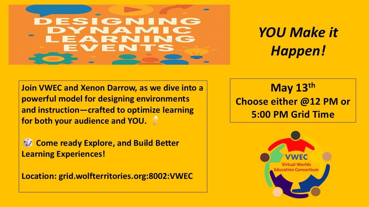 | VWEC in OpenSim presents: Designing Dynamic Learning | VWEC | VWEC in OpenSim presents: Designing Dynamic Learning When: Tuesday, May 13th at either 12:00 PM or 5:00 PM Grid Time Location: grid.wolfterritories.or8002:VWEC Are you building immersive regions? Leading a course? Crafting self-directed learning adventures? Creating an interactive game inworld? Then you’re already part of the vibrant educational and learning pulse in virtual worlds! Join Xenon Darrow and Cooper Swizzle, where we’ll explore a powerful model for designing engaging environments and instruction —-- built to optimize learning for your audience AND for you. Come ready to level up your virtual learning game! For a preview go to: https://sites.google.com/affordable-green.us/designing-dynamic-learning/home | 2025-05-13 17:00:00 | ![]() | Click Here | Savannah Joy |