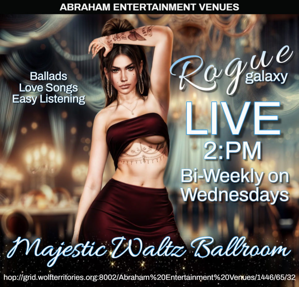 | Rogue Galaxy LIVE at the Majestic Ballroom | Abraham Entertainment Venues | HEY FOLKS! IM PERFORMING AT MAJESTIC WALTZ BALLROM GET ON THOSE FANCY BALLROOM GOWNS & SUITS BRING YOUR PARTNER/LOVER/FRIENDS & COME JOIN US! ABRAHAM ENTERTAINMENT VENUES BI-WEEKLY WEDNESDAYS - 2:00PM RIDE: hop://grid.wolfterritories.org:8002/Abraham%20Entertainment%20Venues/1435/59/33 | 2025-04-09 14:00:00 | ![]() | Click Here | Rogue Galaxy |