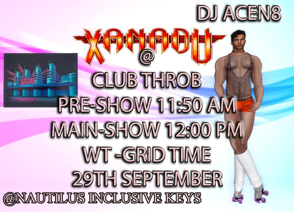 | Club THROB features XANADU Dance Party !!!!! | Nautilus Inclusive Keys | Throb Dance Club with BRIT DJ ACEN8 features XANADU Dance Party !!!!! Come grab your free roller skates and experience XANADU in a new way ! Where : CLUB THROB @ Nautilus Inclusive Keys When : PRE-SHOW 11:50 AM GRID TIME MAIN SHOW 12:00 PM Date : This Monday 29th SEPTEMBER | 2025-09-29 11:50:00 | ![]() | Click Here | Chad Deischer |