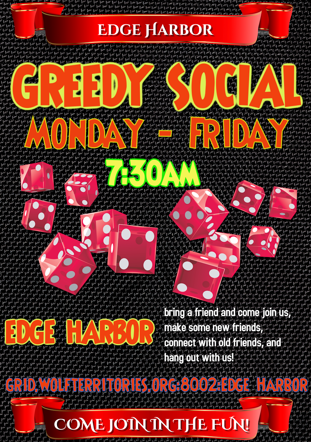 | GREEDY COFFEE SOCIAL | Edge Harbor | Come wake up with us! Bring your coffee or tea and come join us for our morning greedy social! Edge Harbor 7:30am OST Hop: hop://grid.wolfterritories.org:8002/Edge%20Harbor/426/438/23 | 2025-04-11 07:30:00 | ![]() | Click Here | Rogue Galaxy |